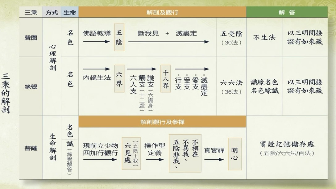 也就是说,在菩萨的观行里面,他要有这个操作。那我们也跟各位说明,请大家看一下这个表,也就是菩萨是要把生命分为名色,还有一个识,就是缘觉的解答,然后以现前立少物,还有四加行的观行,来进行六见处,也就是五阴加上我的这种操作——这种操作型的定义就是“五阴非我、不异我、不相在”的这种操作。可是这样操作还不能实证入胎识,不能实证甚深微妙大光明法,他还要加上真实禅。也就是说,在这个六见处的这种操作型定义之下,同时还要进行真实禅的参究,他才能明心,才能够证得记忆储存的处所。当他证得记忆储存的处所的时候,他就能够完全了知六识、八识还有意根之间的差异。世间人只能证得六识,声闻缘觉对于七、八两个识模模糊糊,声闻人了解的更少,缘觉只是说第八识应该是入胎识,可是入胎识跟意根的重大差异是什么?不知道!他只知道名色可增长,入胎识不可增长,可是详细如何?不知道!